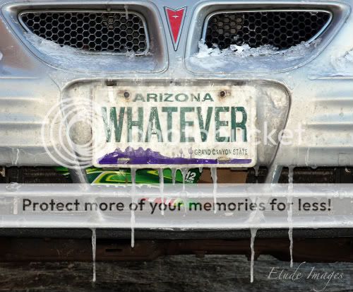 This one was a hoot! I saw this car outside the store and the icicles on this Arizona plate caused a giggle. Then, upon getting down to shoot this, the Mt Dew added an over the top touch-Its all the more ironic becuase the drivers are Apostolic aquaintences- and the back license plate were MICHIGAN! (don't worry you legal beagles-they were fully registered)